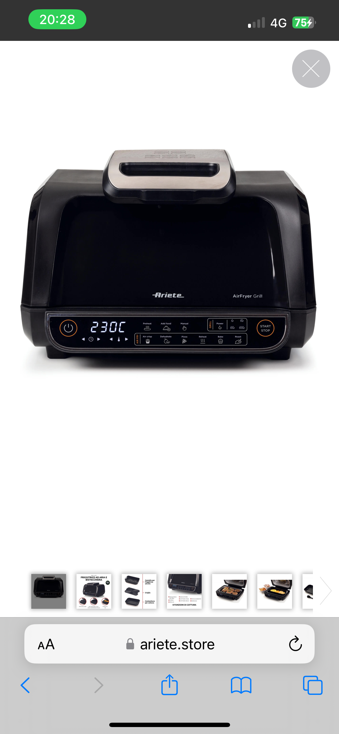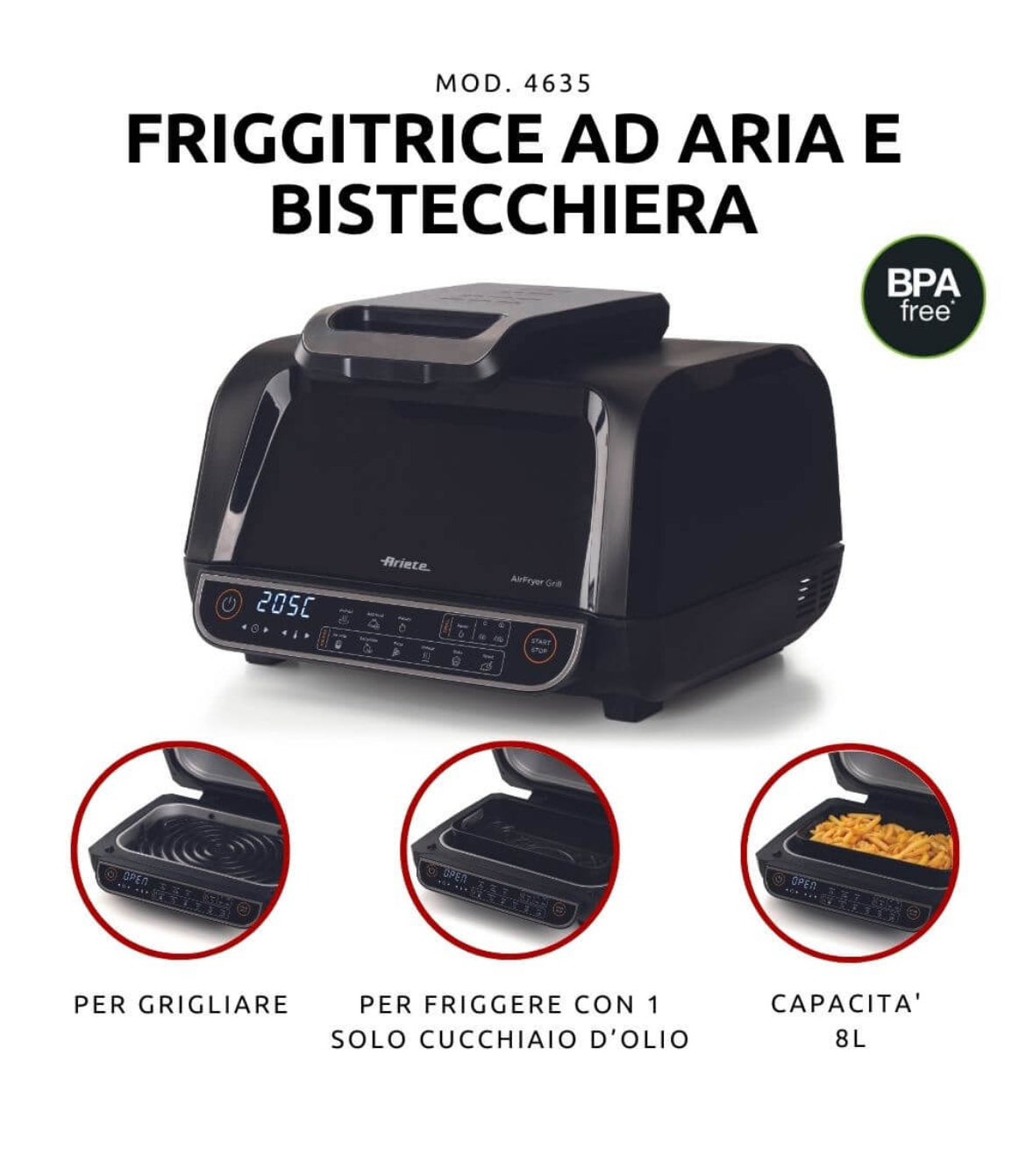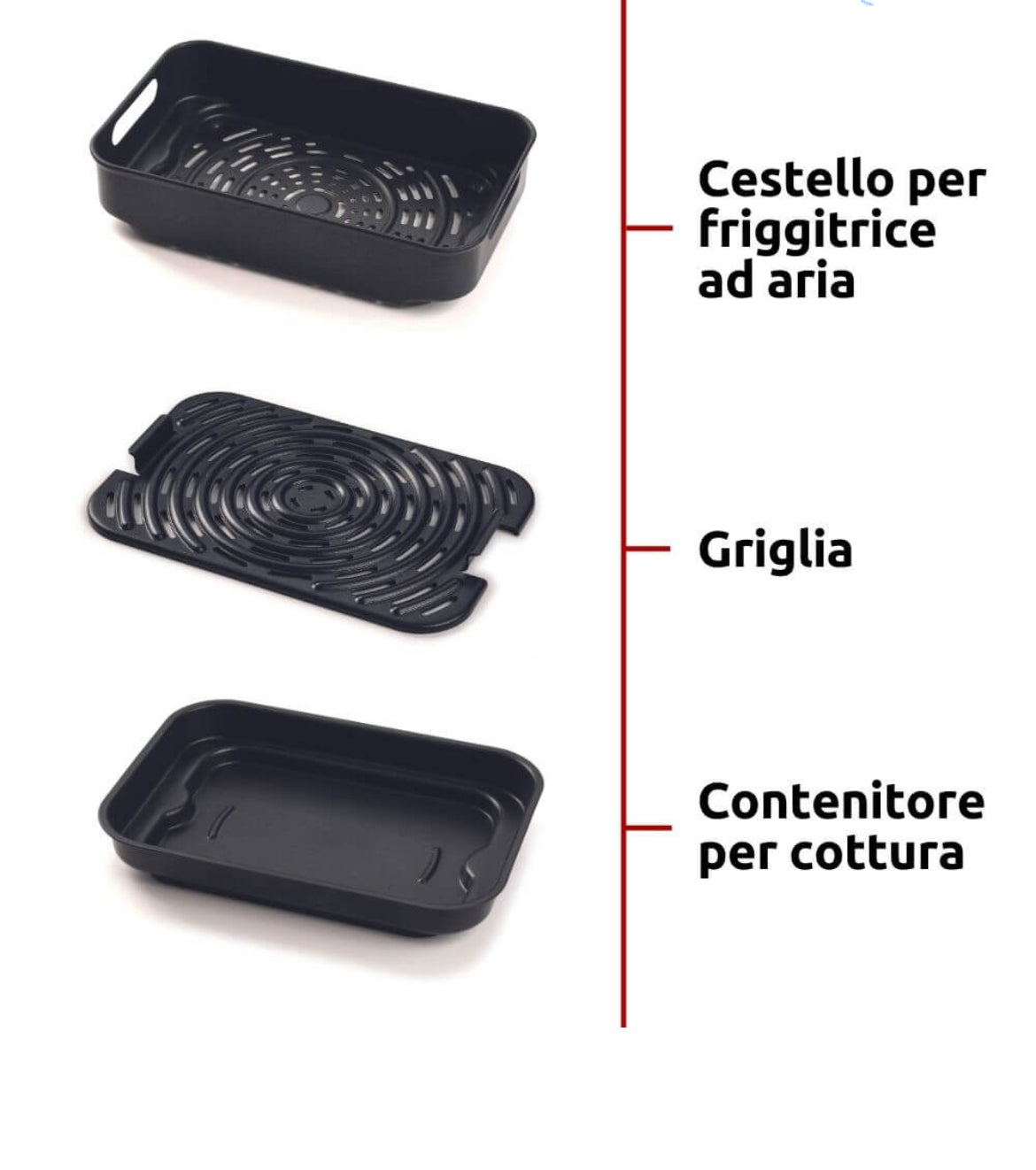 | Accessori | griglia antiaderente, cestello friggitrice forato, contenitore di cottura e spazzolino per una pulizia facile e completa |