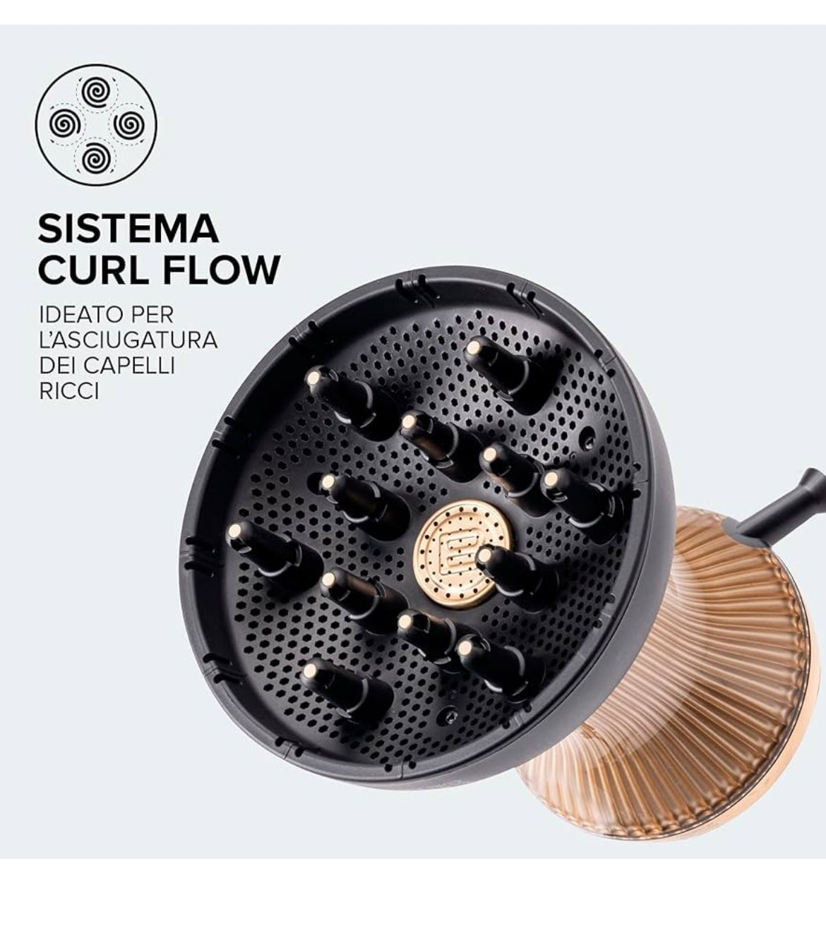 Diffon Supreme, grazie al sistema Supreme Curl Flow, progettato per distribuire uniformemente l'aria intorno ai capelli, simula un'asciugatura naturale e riduce l'effetto crespo, per ricci mai così belli.