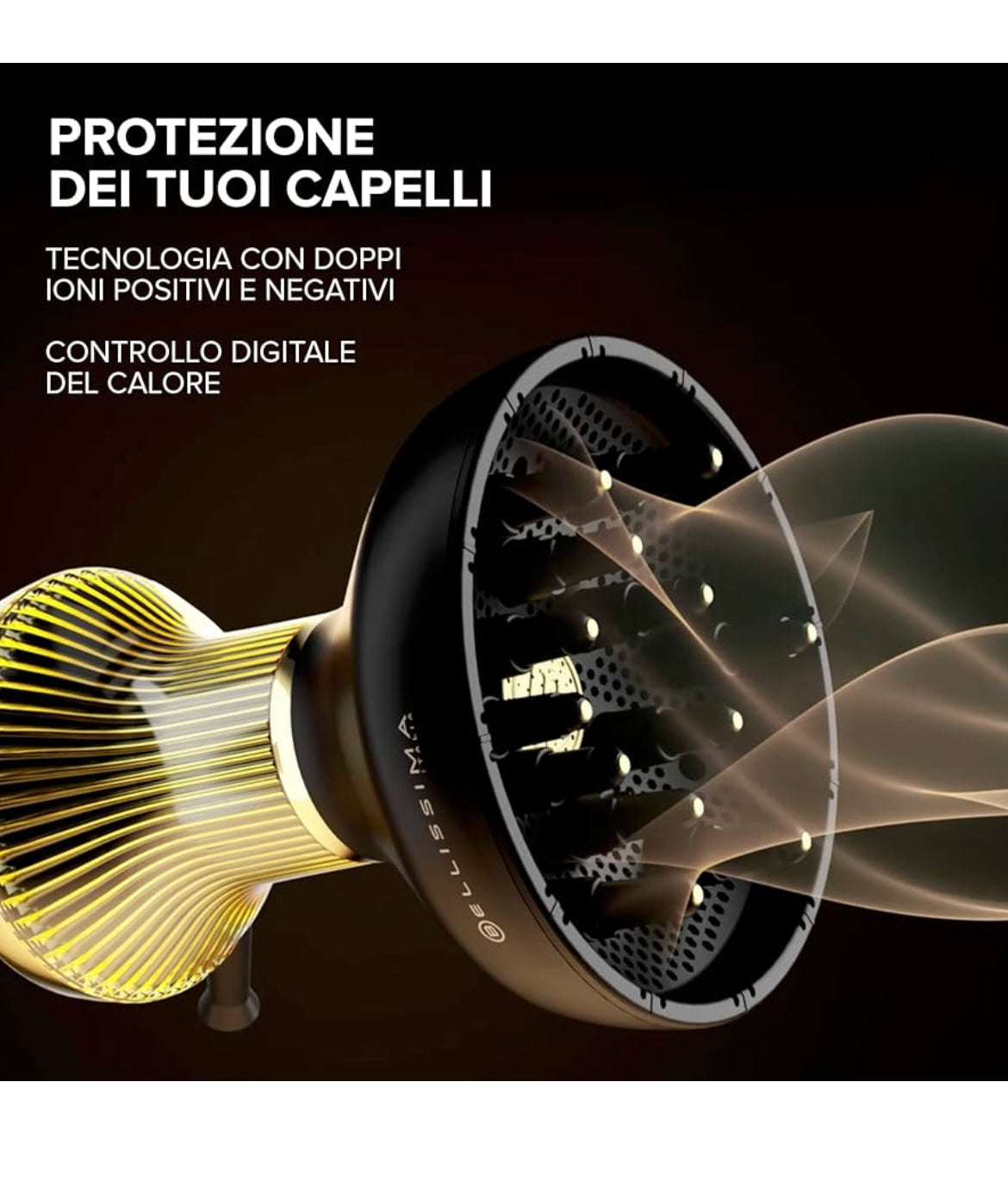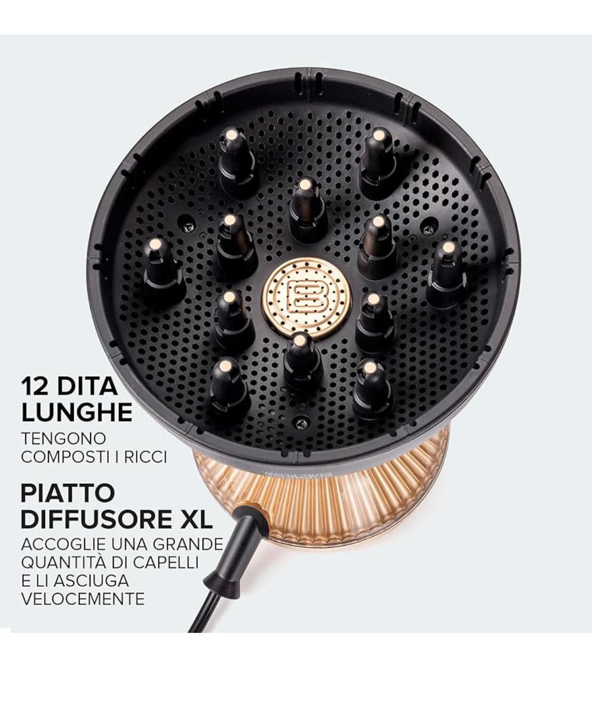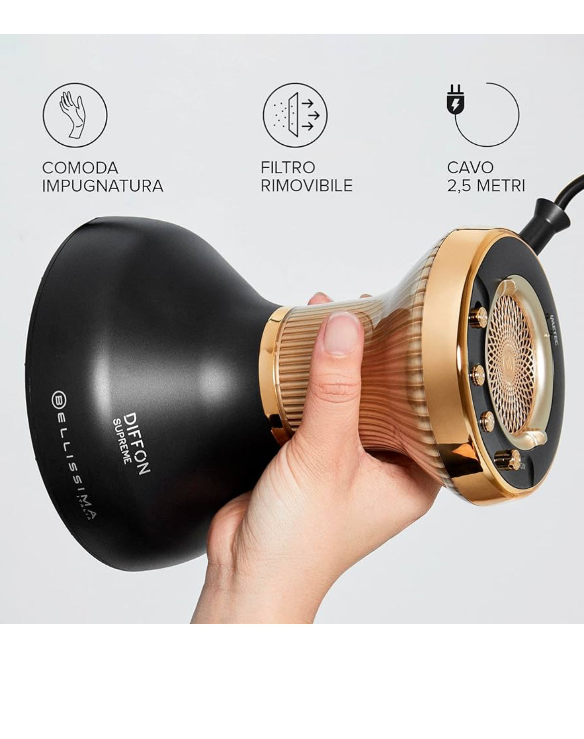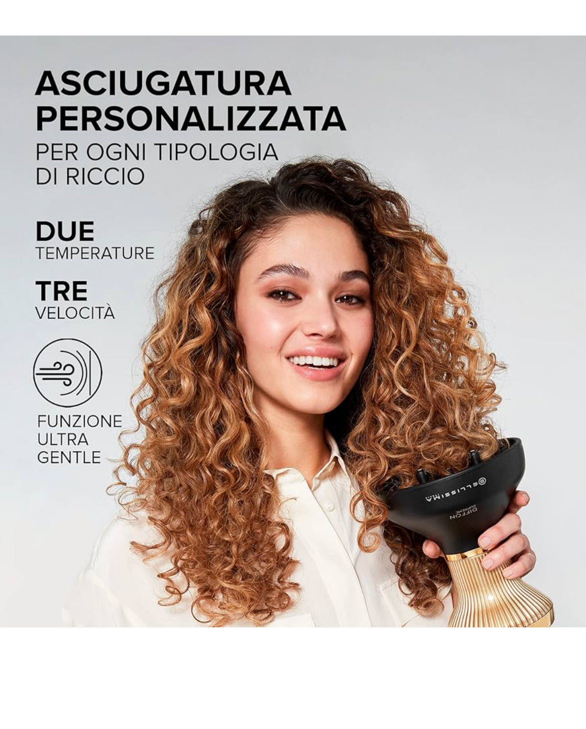 Bellissima Diffon Supreme è il diffusore ad aria caldache integra diffusore e asciugacapelli in un unico strumento, per un'asciugatura personalizzata che valorizza la bellezza dei tuoi ricci.
