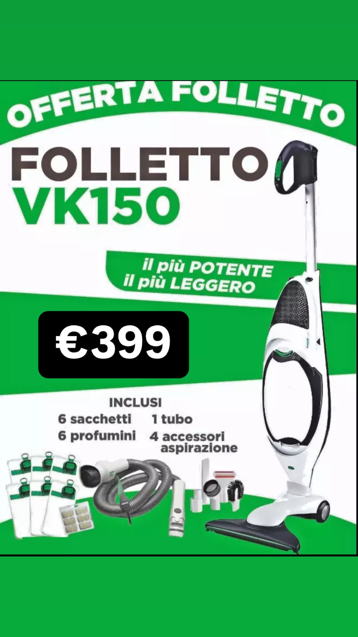 Scopri il potente ed elegante Folletto VK150, un aspirapolvere nuovo, progettato per una pulizia efficace e pratica. Questo modello viene fornito con 6 sacchetti compatibili e 6 profumi, ideali per mantenere gli ambienti sempre freschi e puliti.