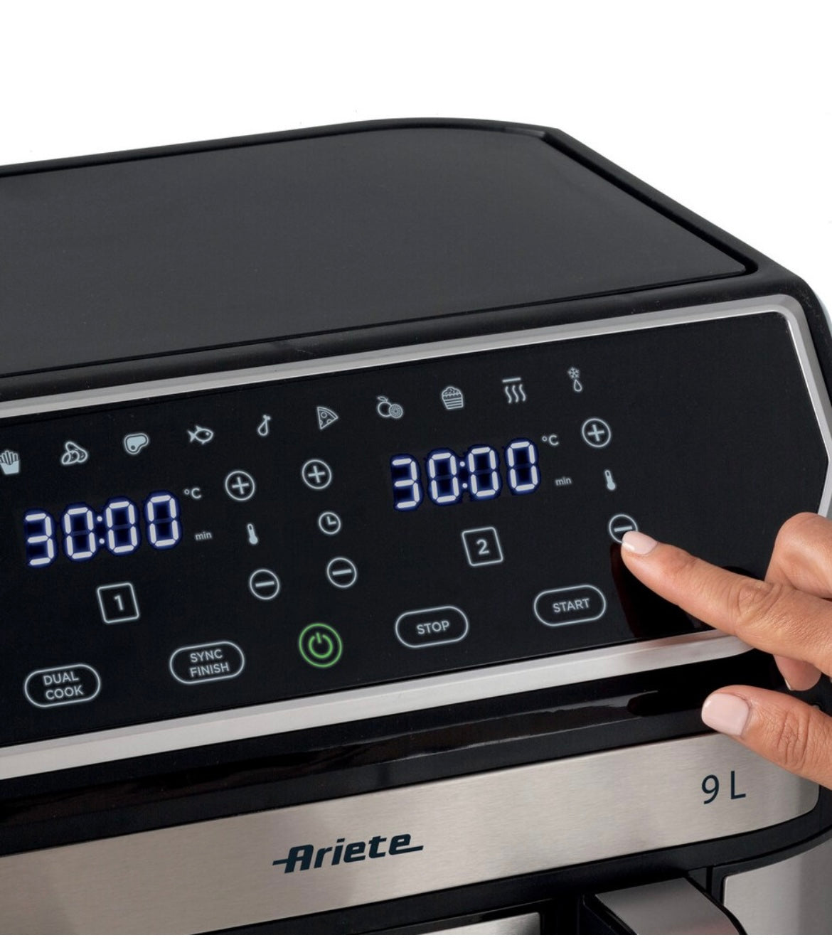 Con la Friggitrice ad aria 9L puoi friggere qualsiasi pietanza in doppia quantità, utilizzando un solo cucchiaio di olio per ottenere fritture sane e gustose allo stesso tempo. Grazie ai 2 cestelli separati, 4,5 L per uno, con Friggitrice ad aria 9L di Ariete potrai cuocere fino a 3,6 kg di patatine fritte in una sola volta! Patatine fritte, ma non solo, anche crocchette, pesce, carne e tanti altri alimenti impanati, sia surgelati e pronti da friggere, che freschi e appena impanati, grazie a 8 programmi preimpostati.