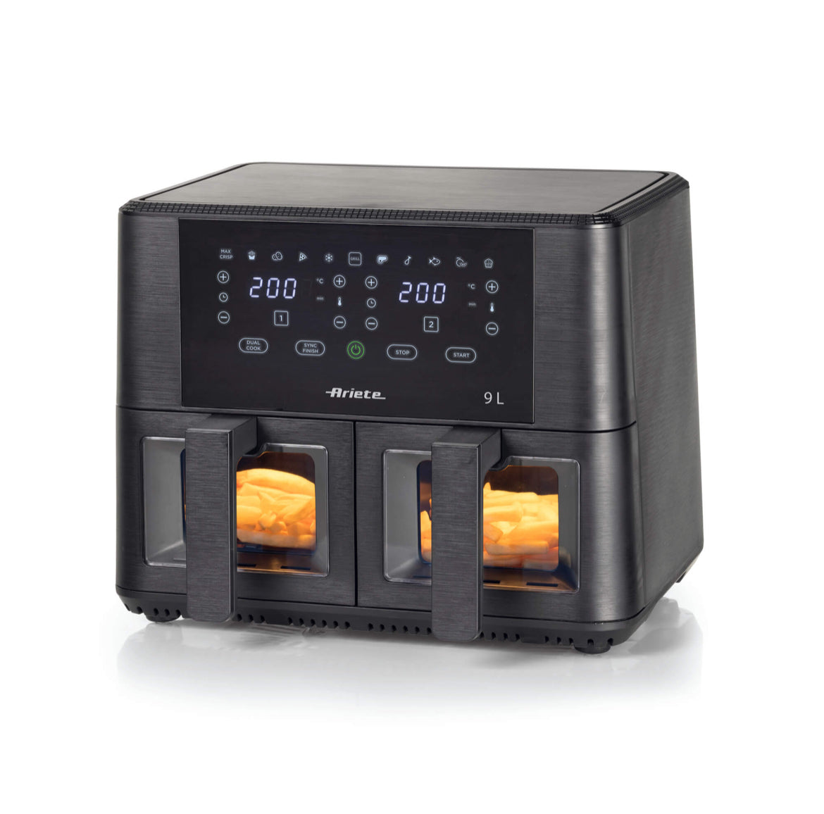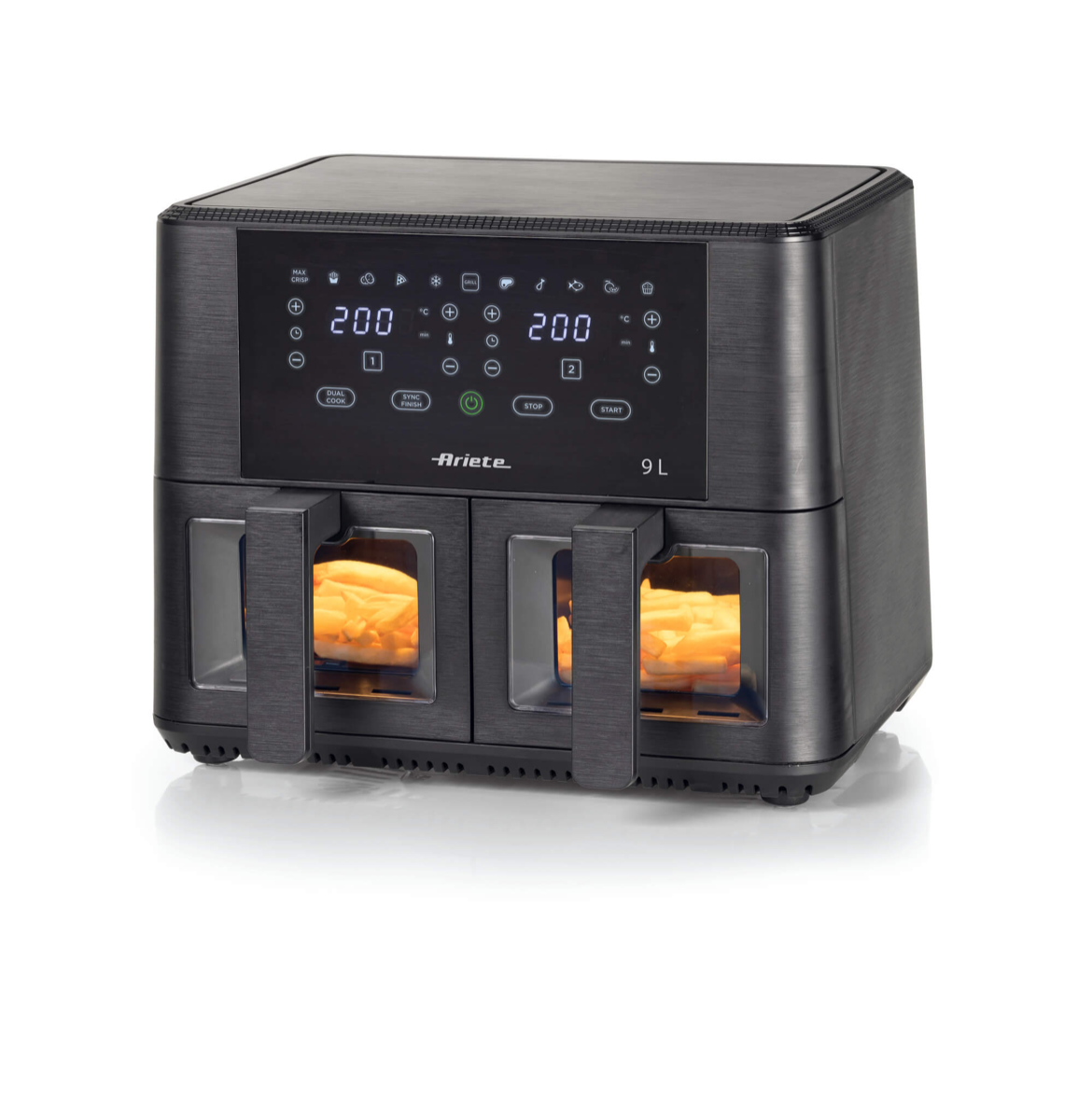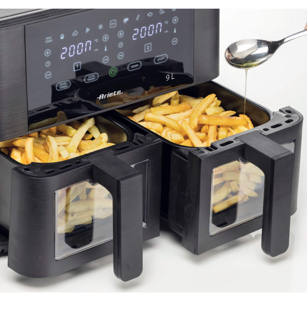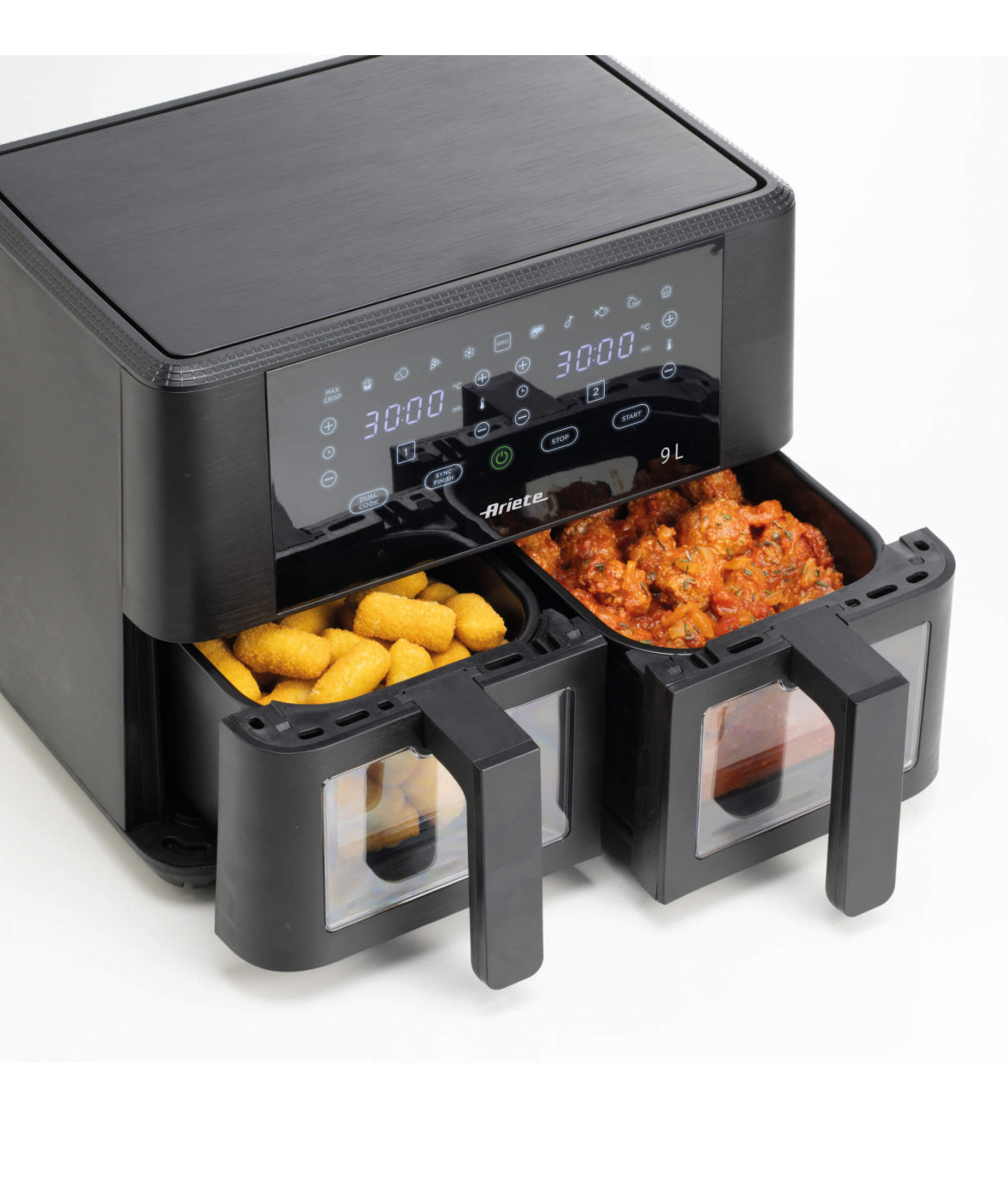La camera ad aria di Friggitrice ad aria Doppia 9L abbraccia il cibo a 360° e crea le tue pietanze preferite, dolci e salate, senza grassi aggiunti