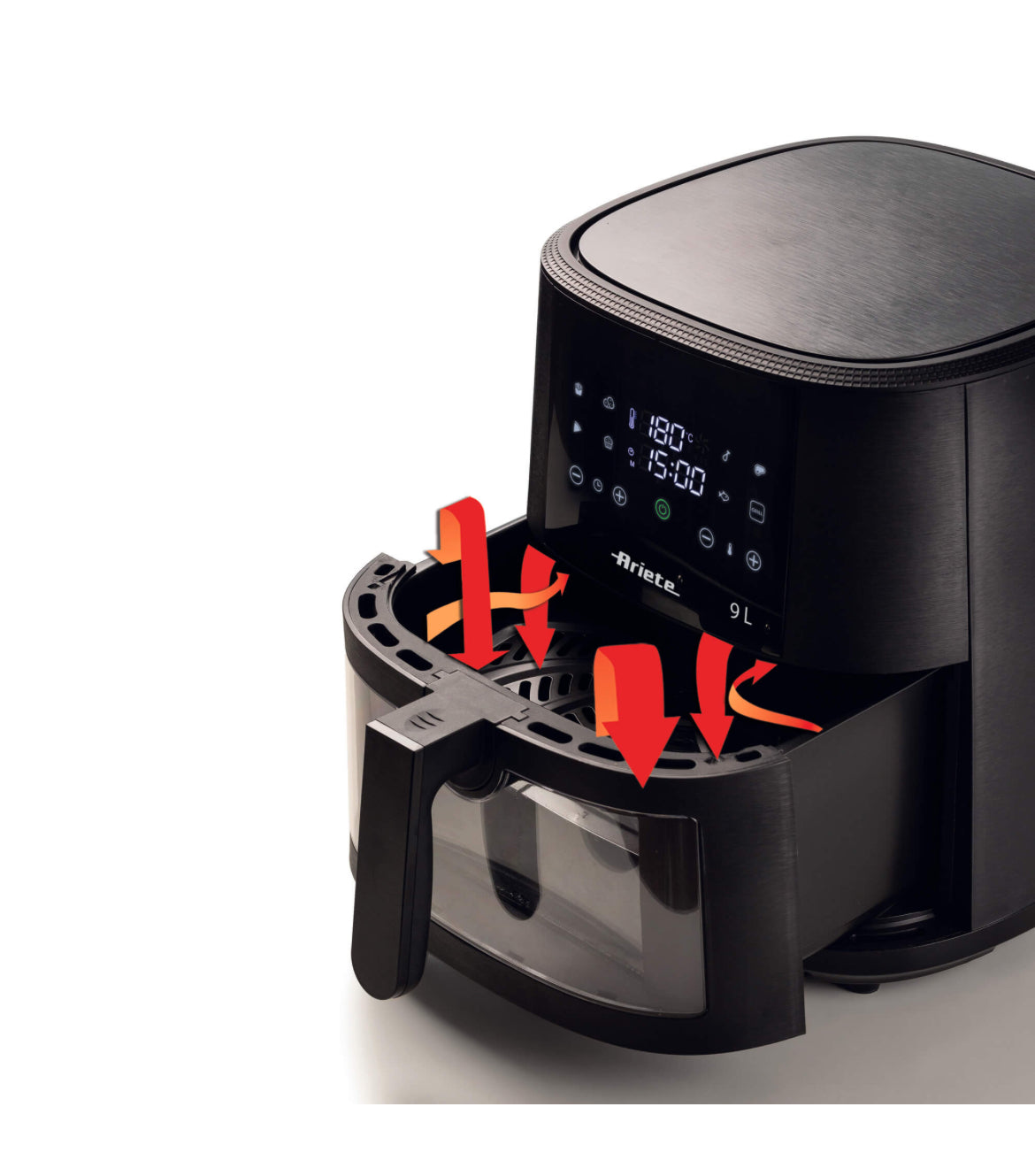 Frittura sì, cattivi odori no! Con la friggitrice ad aria 9L friggi qualsiasi alimento, senza fumo e senza lasciare un fastidioso odore di fritto in casa tipico delle friggitrici ad olio. L’aria ad alta temperatura infatti circola all’interno della friggitrice ad aria, cuocendo velocemente e senza grassi, senza far uscire all’esterno fumo e odori
