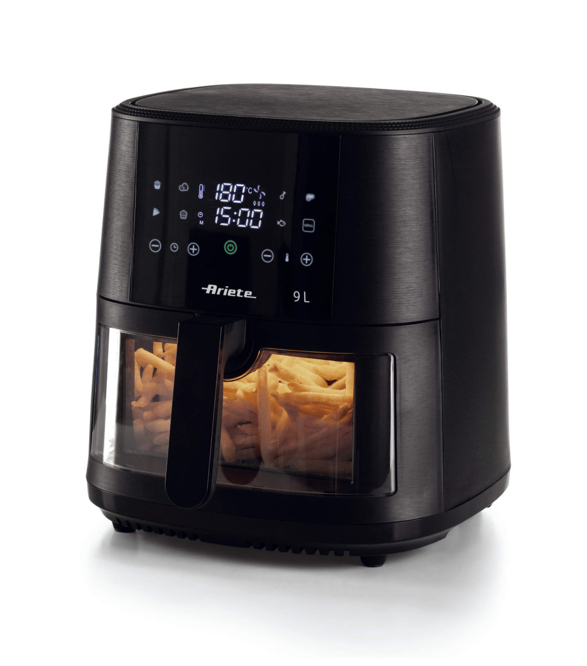 Friggitrice ad aria 9L con vetro Nero 4630/00 Per grandi quantità di fritto e tanta croccantezza. Adatta a fritture di pesce, carne, crocchette, patatine e alimenti impanati. 8 programmi preimpostati ideali per cene in famiglia e con amici. BPA Free