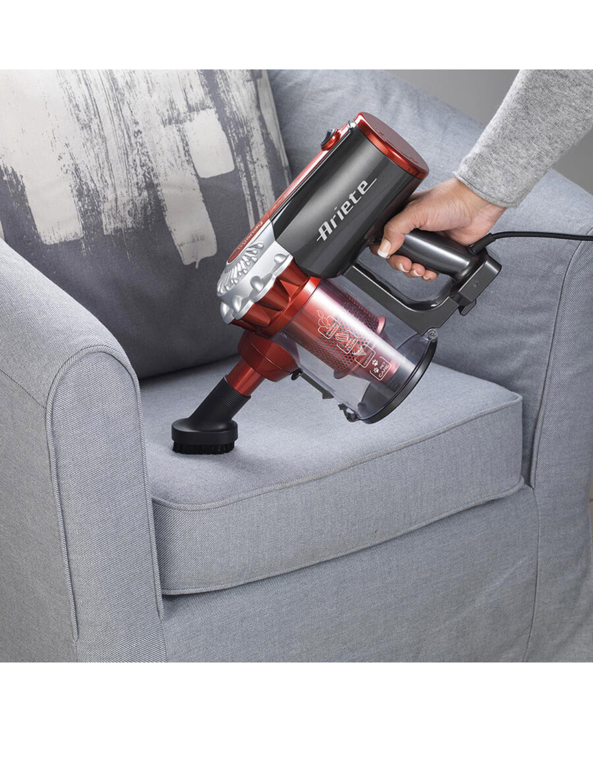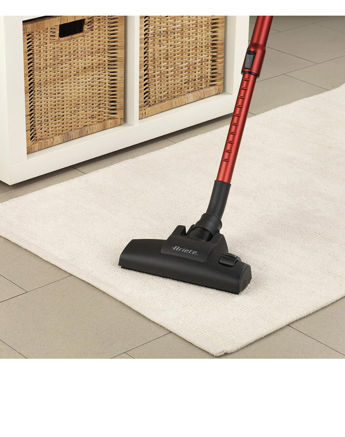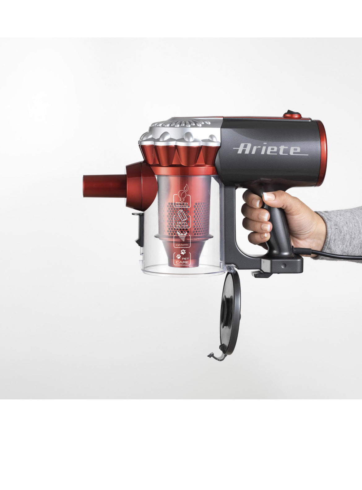 Handy Force Ariete 2761 è la scopa elettrica con filo leggera e maneggevole, che si trasforma facilmente in un pratico aspirabriciole portatile per la pulizia di tutti gli ambienti e gli angoli della casa. La scopa elettrica con filo è potente e ideale per la pulizia di pavimenti di ogni genere, tappeti e moquette, grazie alla tecnologia ciclonica senza sacco, che consente di aspirare anche lo sporco più ostinato. Con una sola mossa la scopa elettrica Handy Force si trasforma in un aspirabriciole portatile con beccuccio perfetto per la pulizia di angoli e fessure difficili da raggiungere, mensole e piani. Utilizzando l'apposito accessorio tessuti, con Handy Force si possono aspirare in un istante anche divani, poltrone e cuscini.