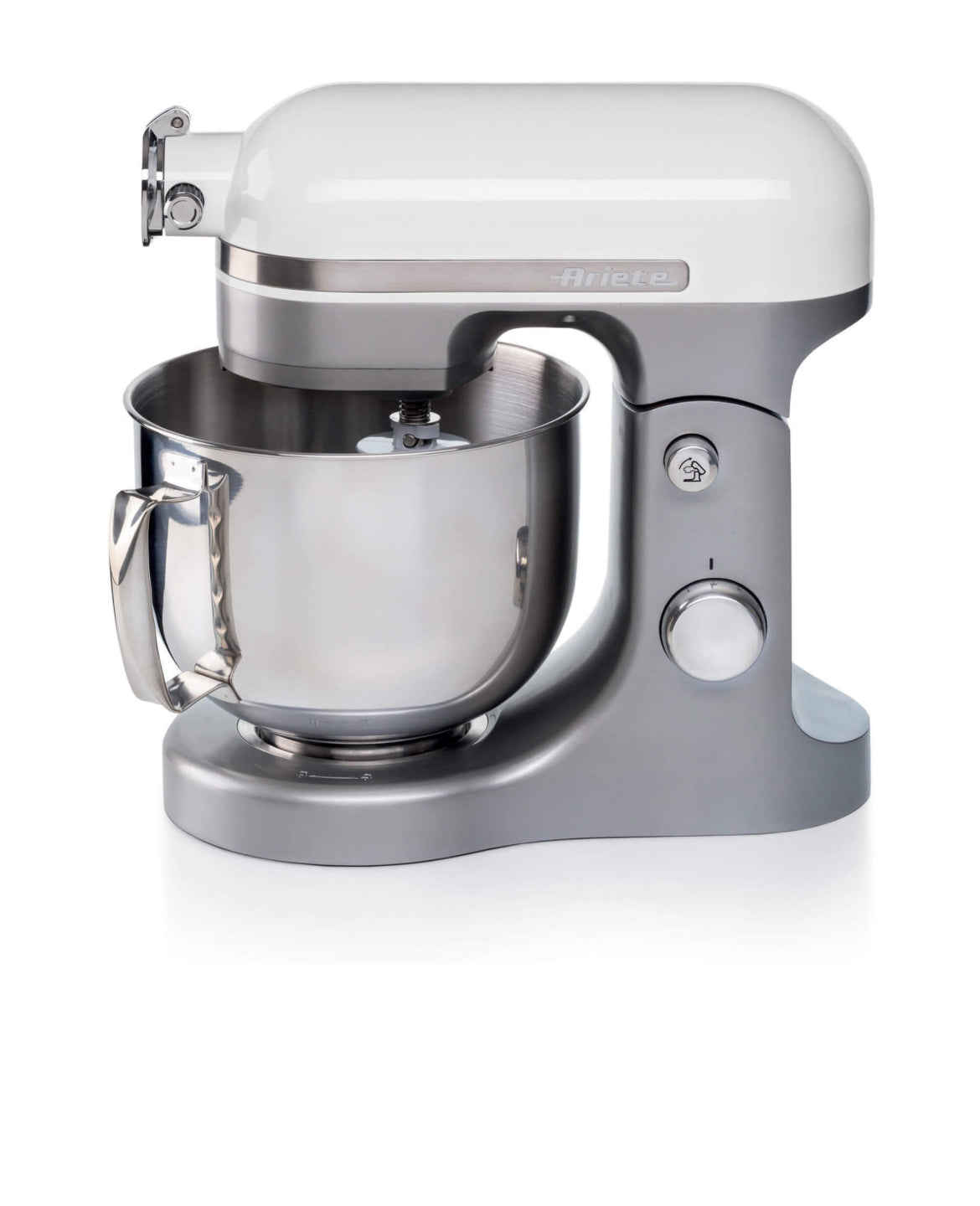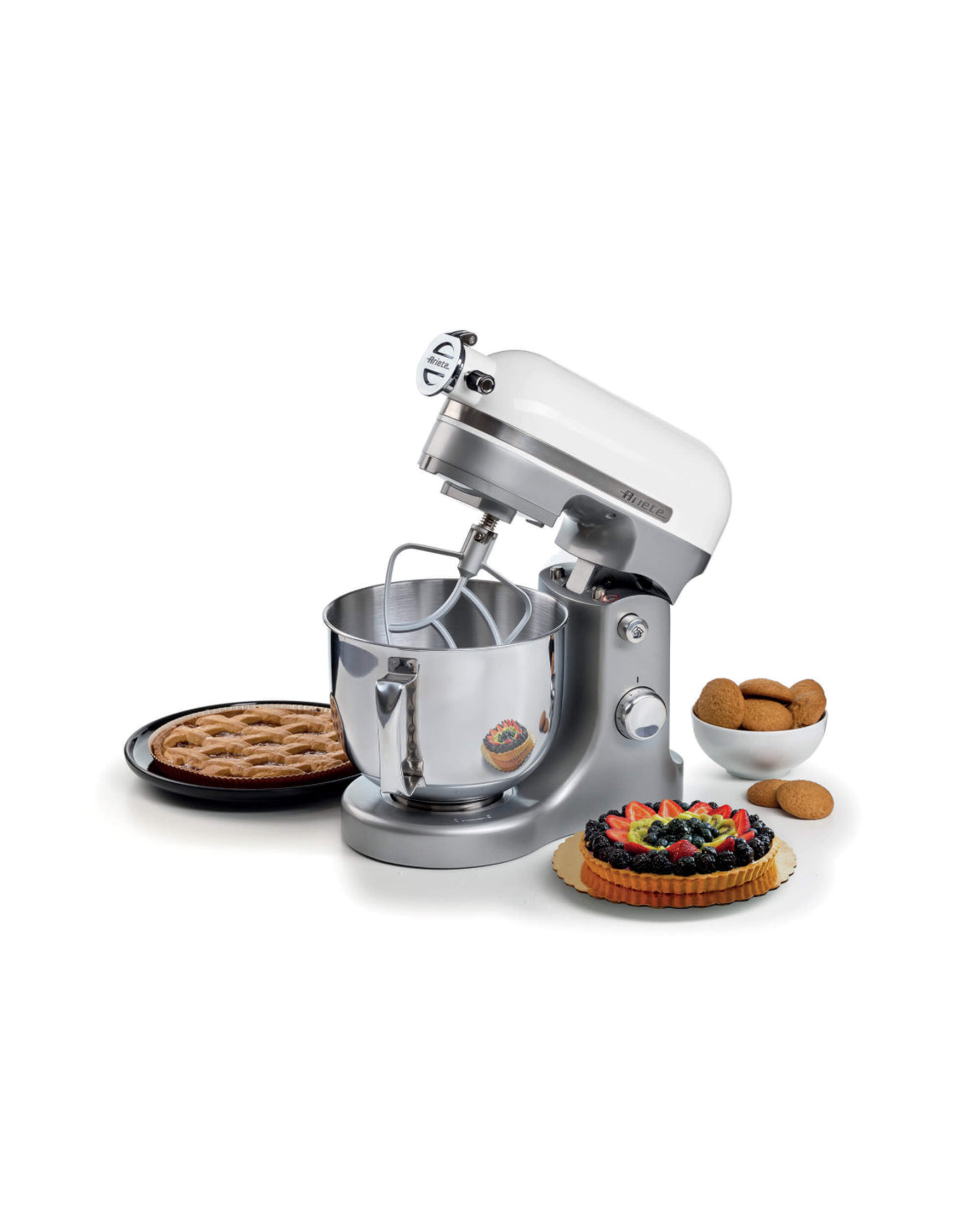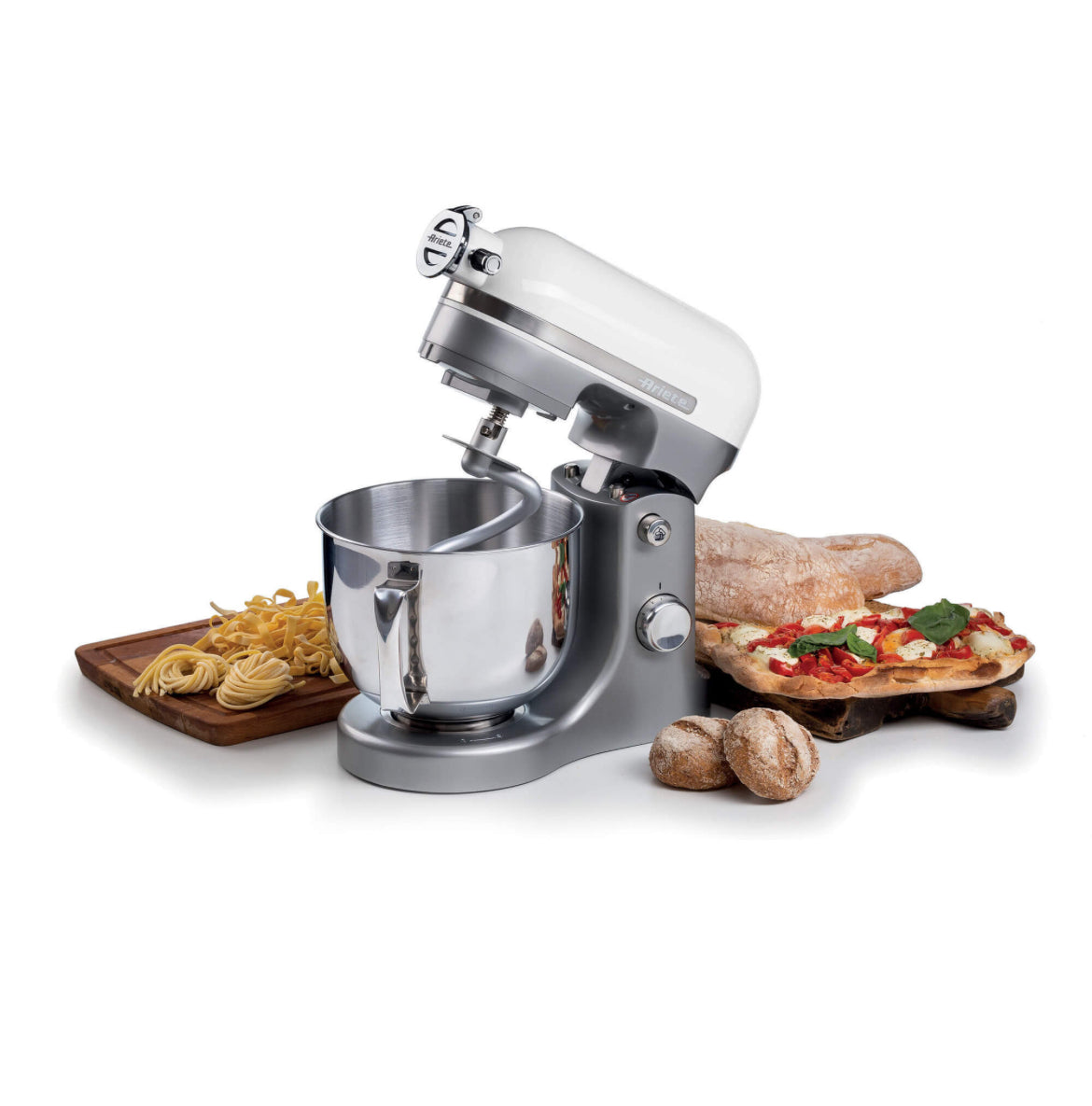 Impastatrice Moderna Bianca 1589/01 Planetaria in alluminio pressofuso, design elegante e capiente tazza in acciaio inox da 5,5L con maniglia. Solida, silenziosa e potente grazie ai 1600W e alle 11 velocità di movimento planetario, è ideale per amalgamare