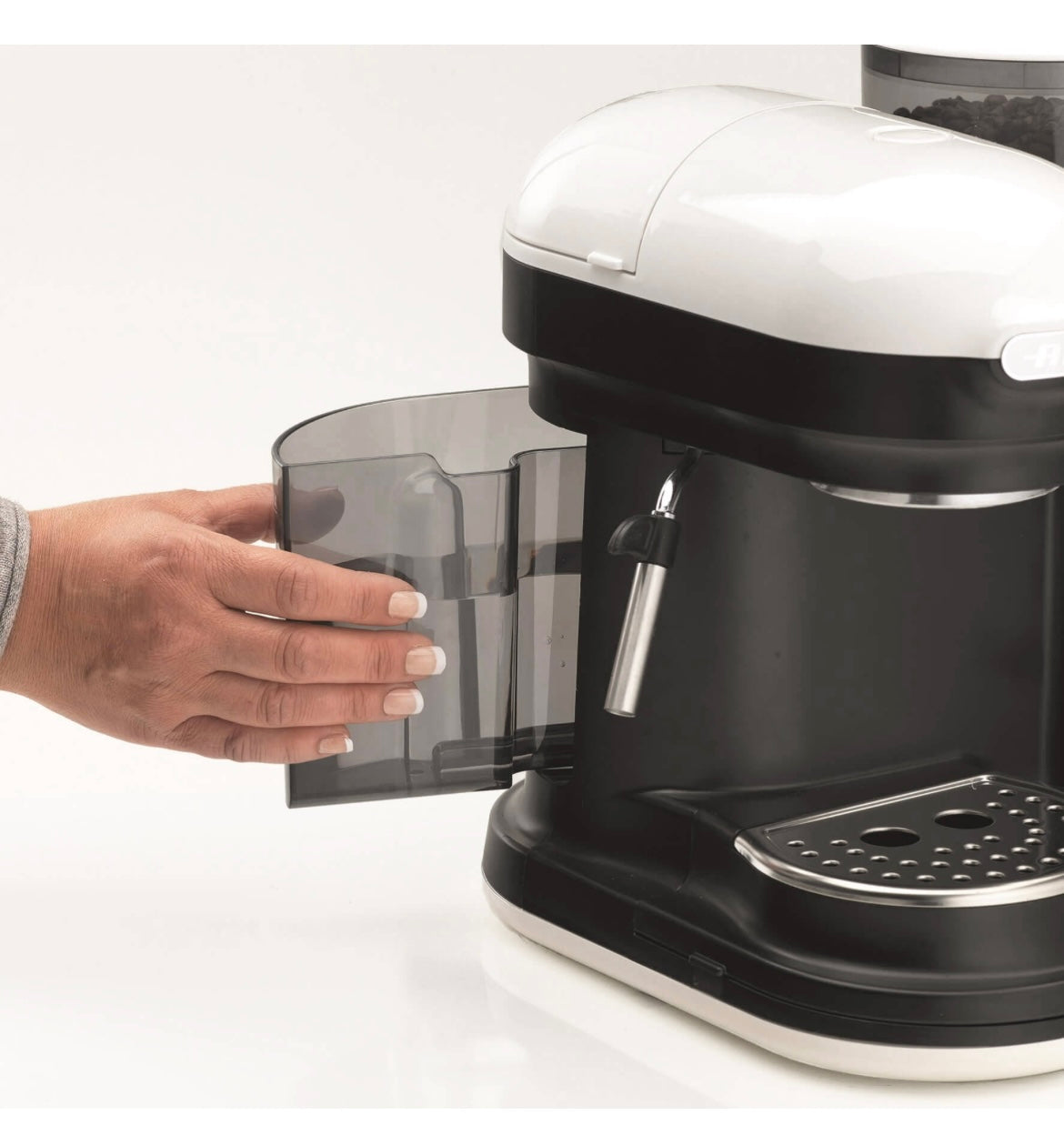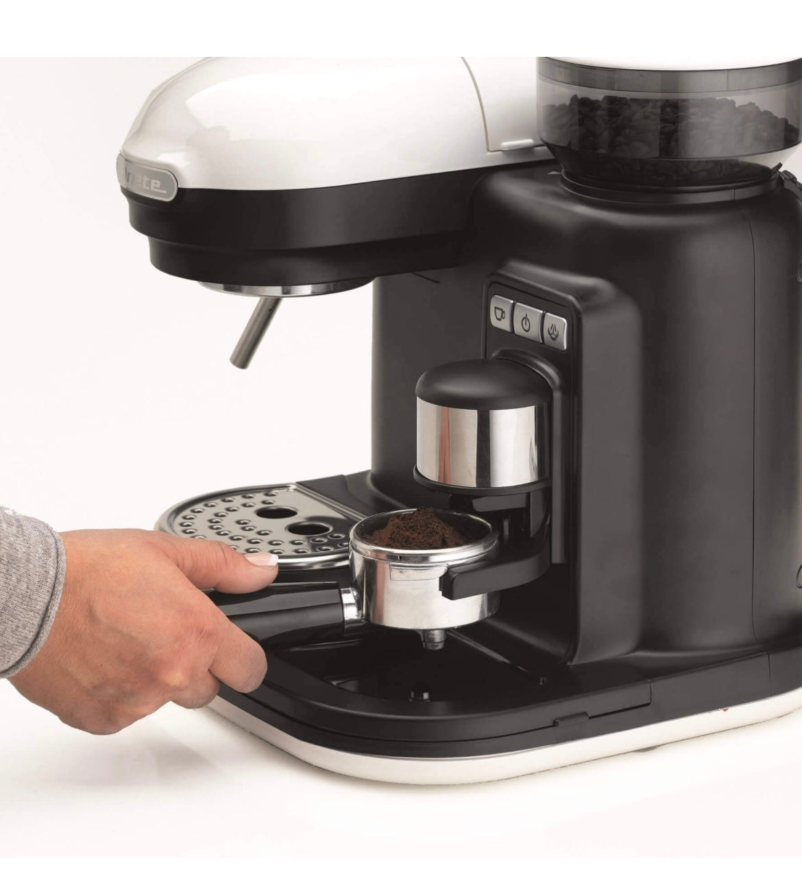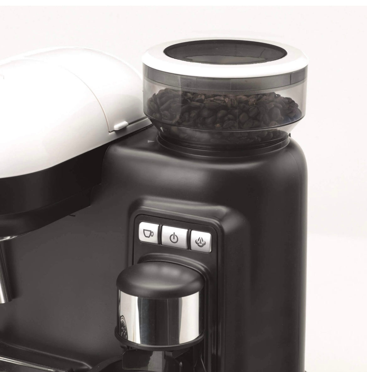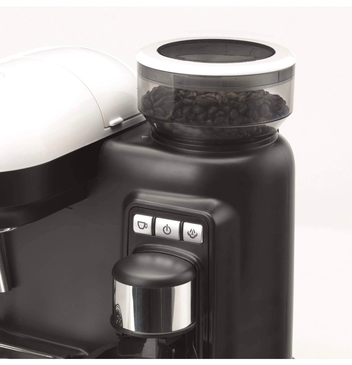 Macchina da caffè espresso con macinacaffè Moderna Bianco. Macinacaffè con erogatore. Filtro per 1 o 2 tazze.15 bar pressione. Autospegnimento. Cappuccinatore. Bianco
