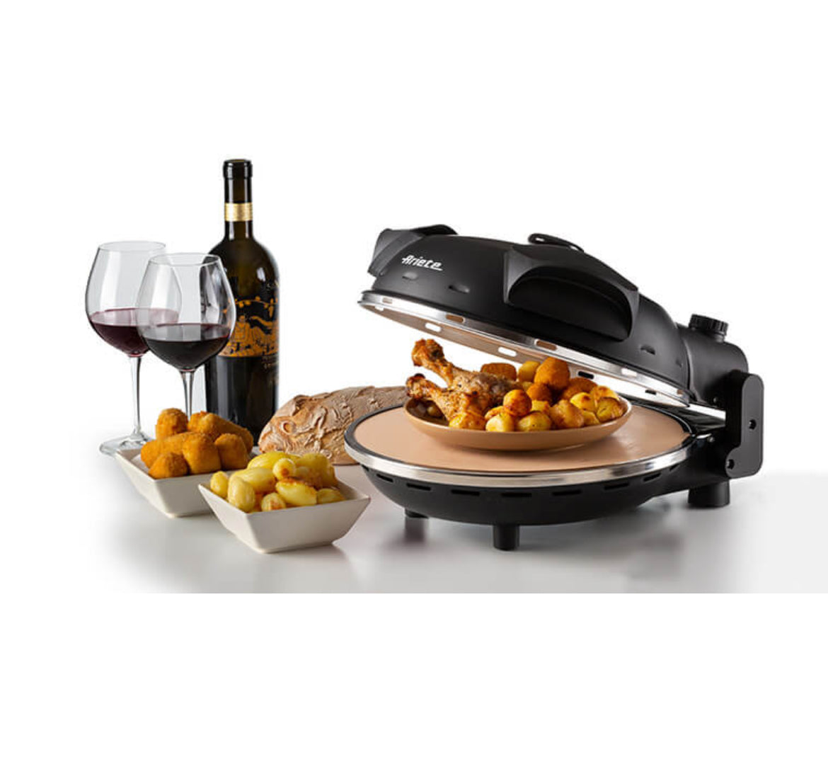 Il forno pizza di Ariete sarà l’alleato in cucina di tutti gli amanti della pizza. Il prodotto migliora le sue prestazioni con una piastra in pietra refrattaria di alta qualità dal diametro di 32cm che permette di cuocere e/o riscaldare pizza e focacce a cinque livelli di cottura, fino a una temperatura massima di 400 gradi. La pietra refrattaria è dotata di un trattamento trasparente antiaderente che rende la pietra refrattaria super resistente a macchie e residui e permette di mantenere la qualità della pietra nel tempo.