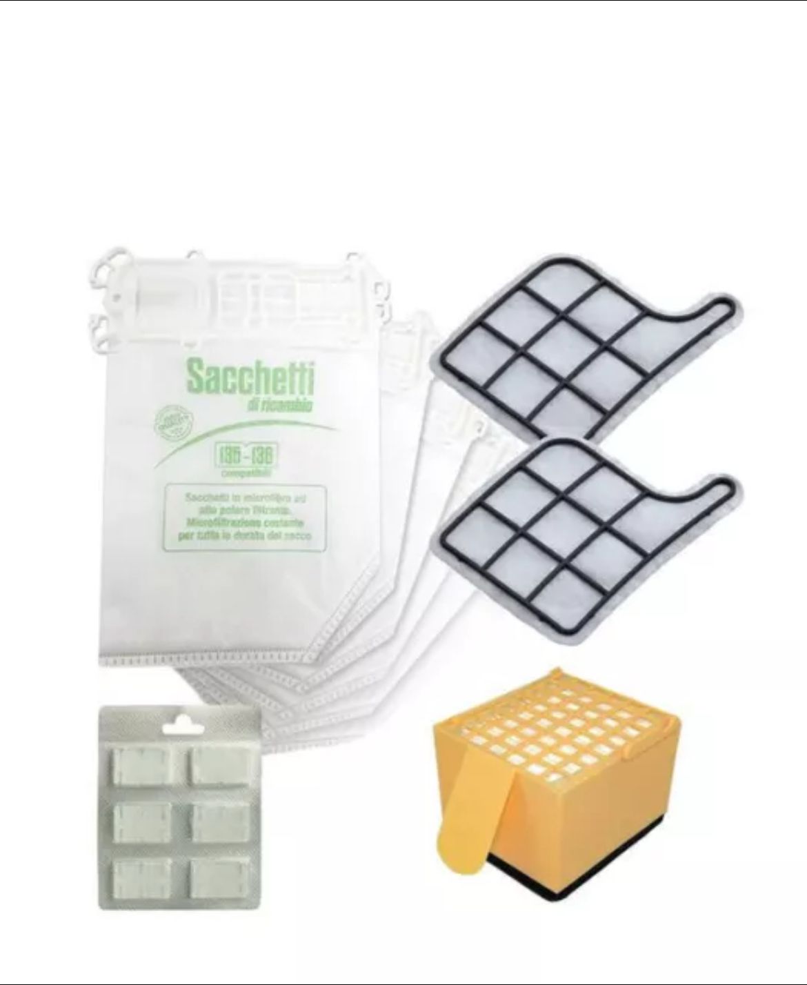 Set farfalla compatibile con folletto vk135/136, il set comprende il filtro hepa, un pacco di sacchetti, il filtro griglia e i profumini