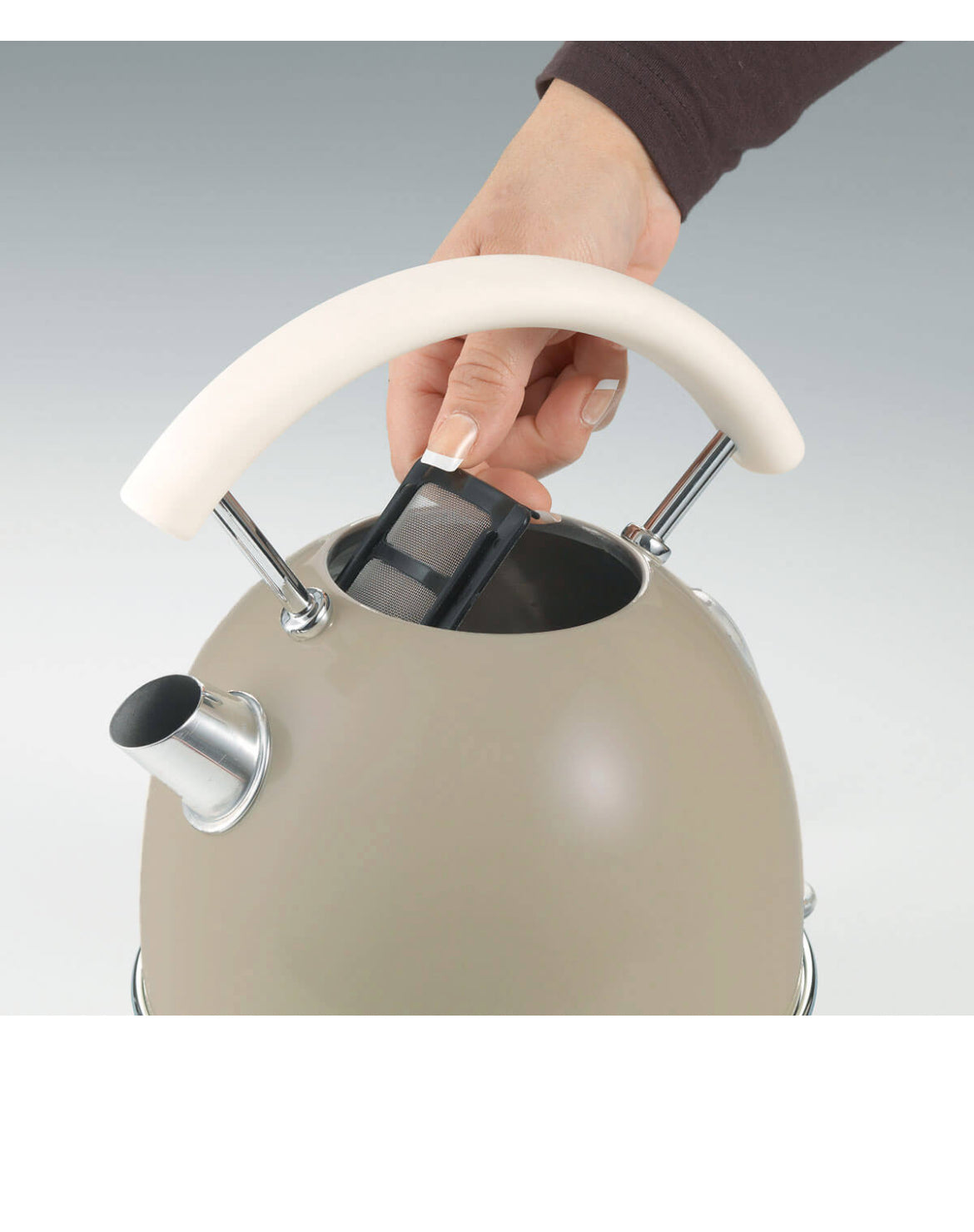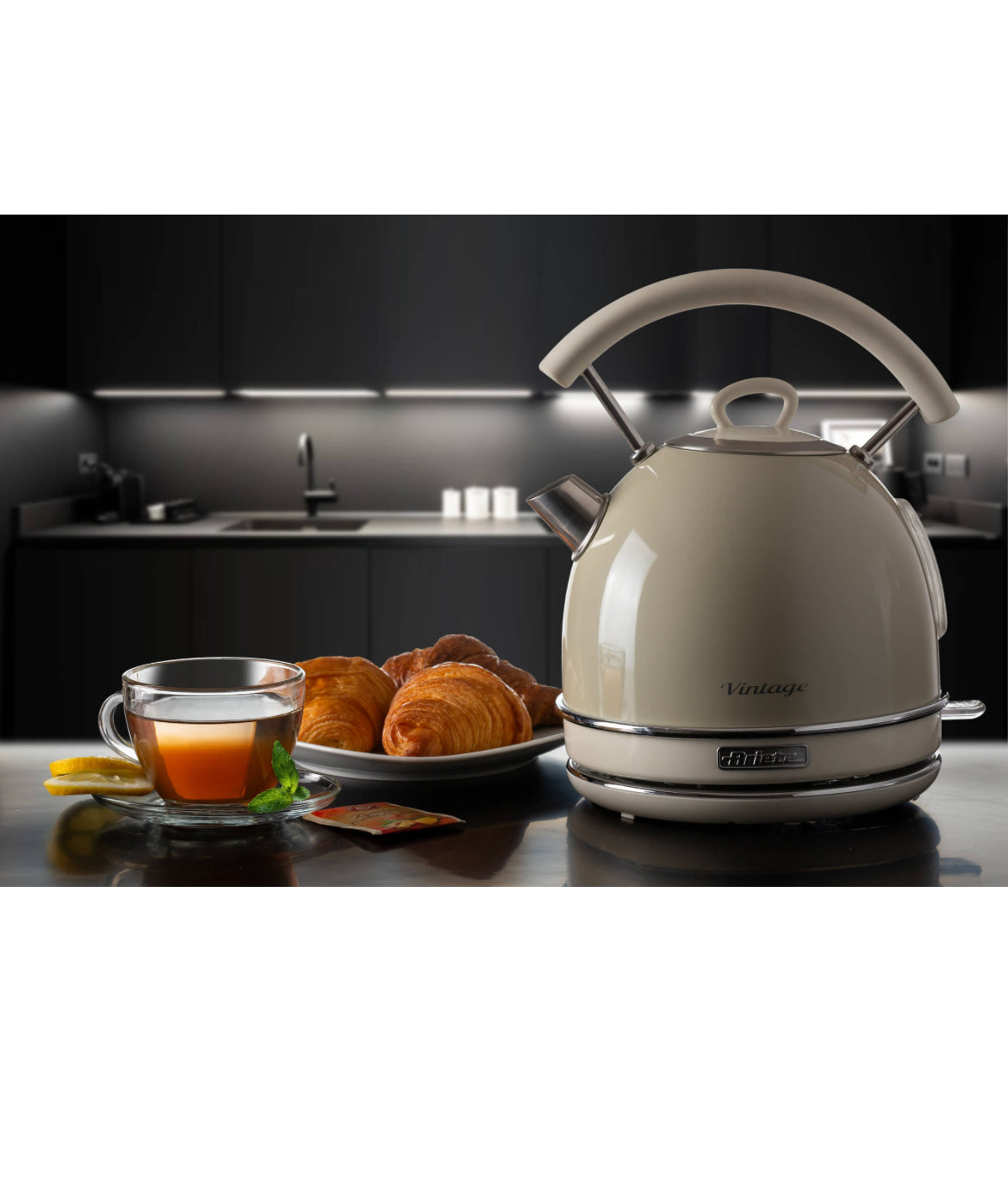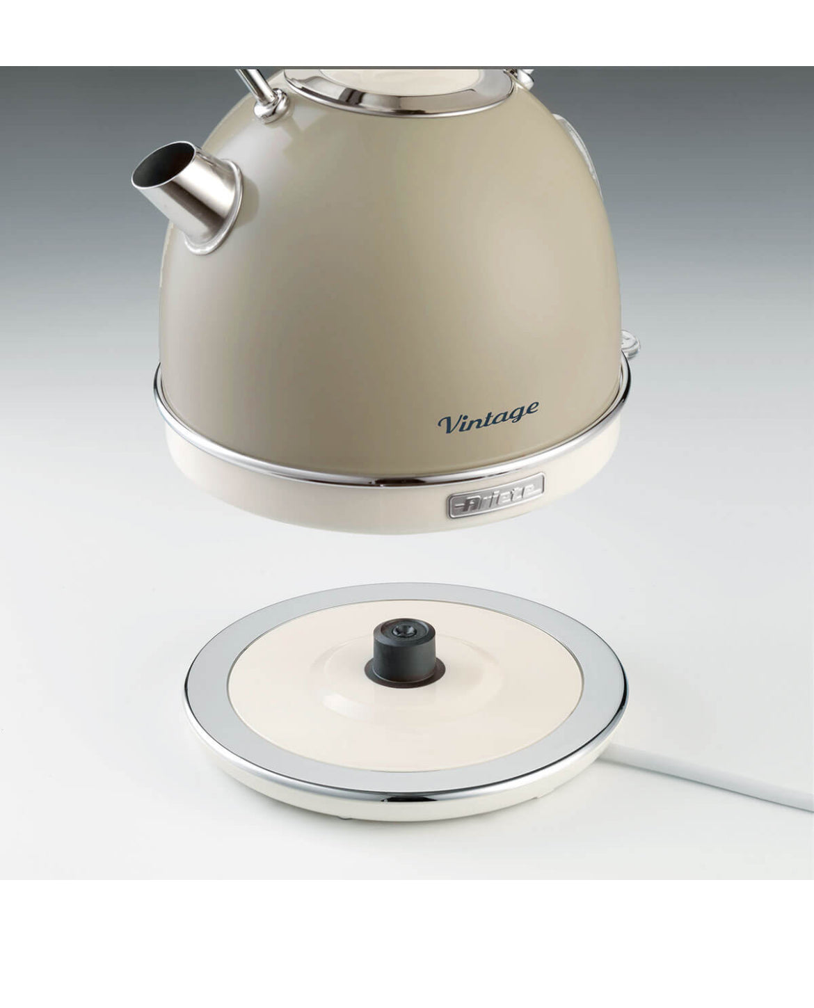 Bollitore Vintage dal design retrò che richiama le forme di una volta, indispensabile per assaporare al meglio il momento della colazione o della pausa pomeridiana. Il bollitore elettrico è dotato di filtro tisana removibile e facilmente lavabile, di impugnatura ergonomica con finitura soft touch e di un sistema di autospegnimento, rappresenta un alleato irrinunciabile in ogni cucina.