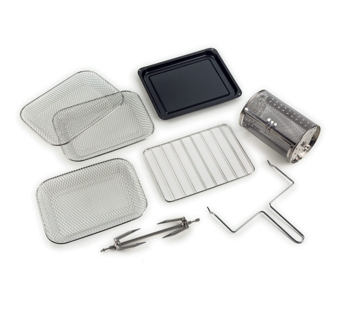| Accessori | 3 cestelli forati in acciaio inox, cestello rotante in acciaio inox, griglia in acciaio inox, set girarrosto in acciaio inox e leccarda |