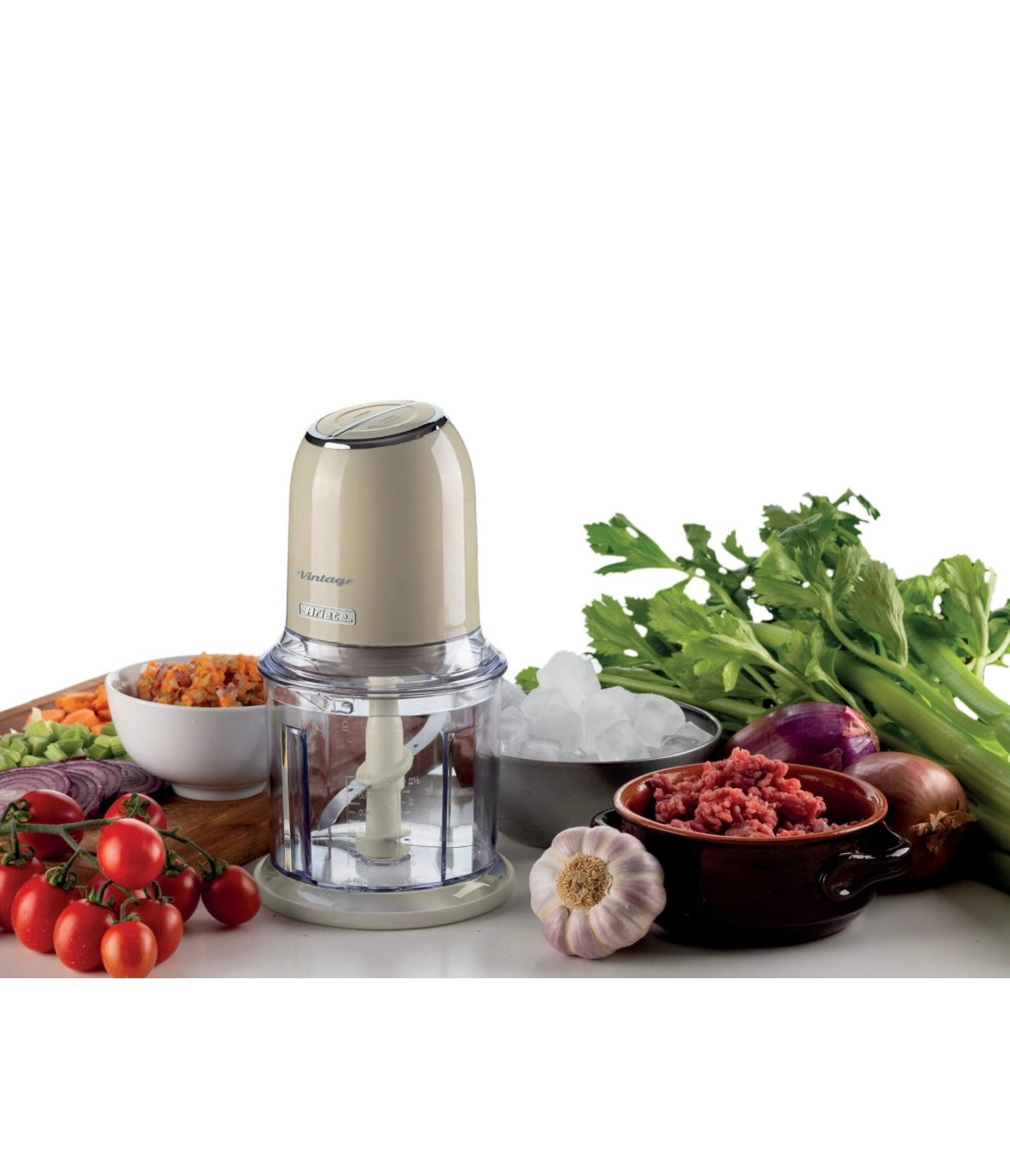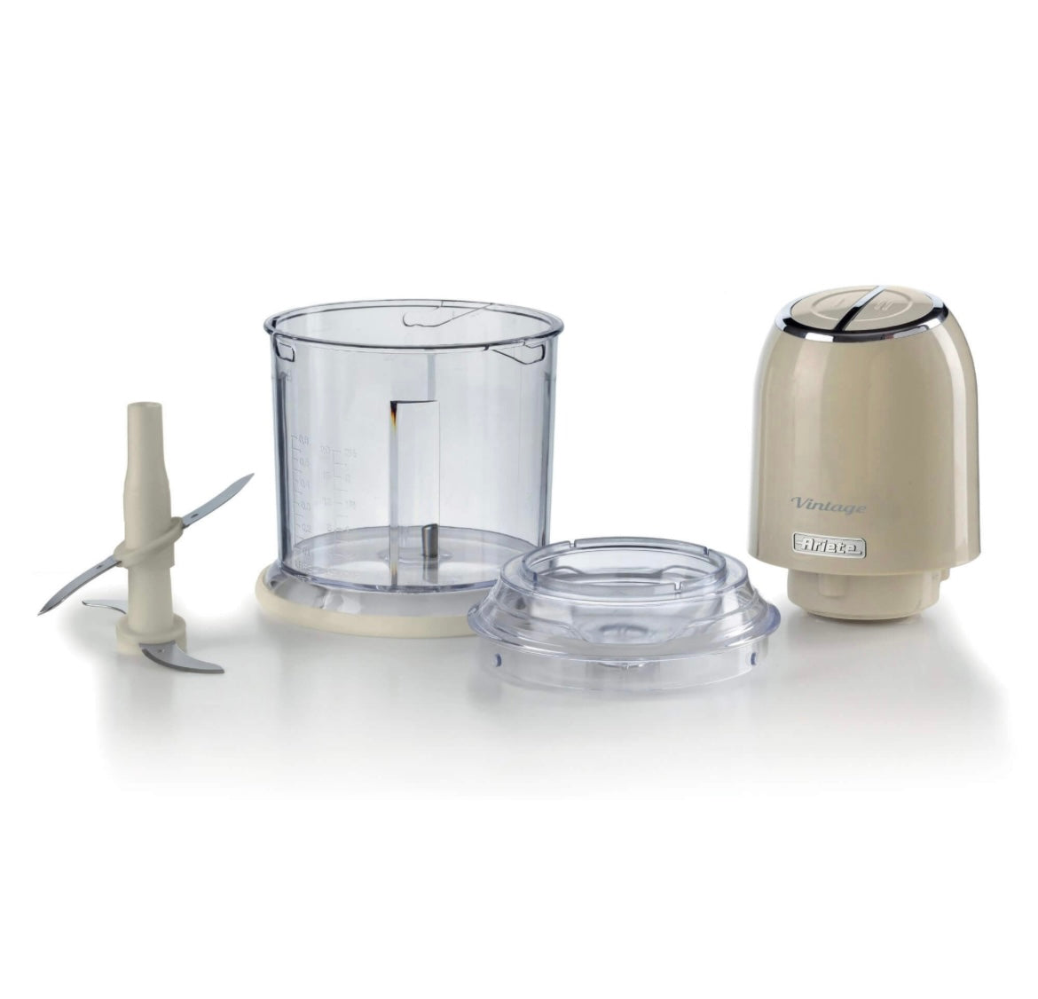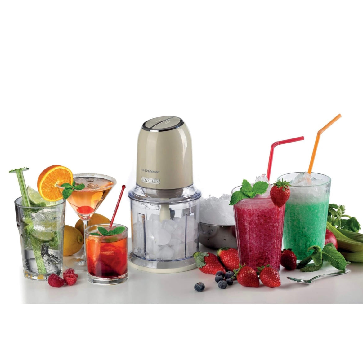 Vintage Tritatutto Vintage Beige 0438/03 Tritatutto a 2 velocità , 2 pulsanti e 4 lame in Acciaio Inox. Tritaverdure e Tritaghiaccio. Tazza graduata da 600ml.