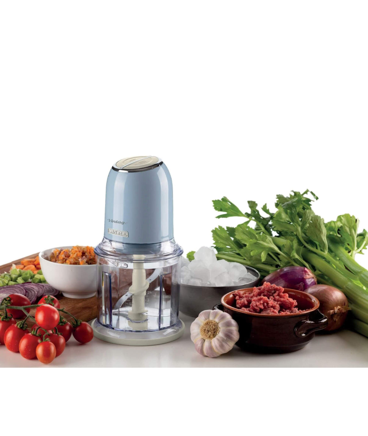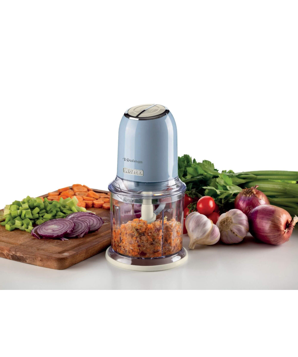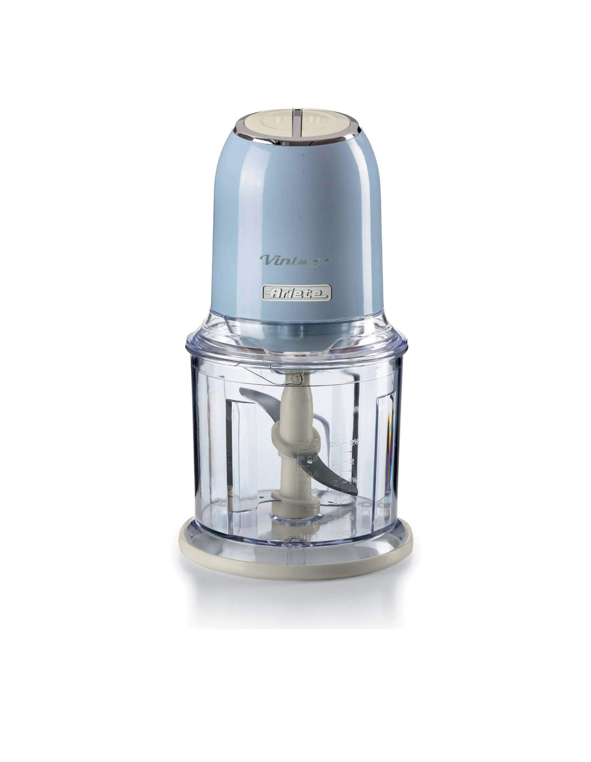 La Linea Vintage di Ariete si arricchisce di un prodotto indispensabile per le tue ricette in cucina: un tritatutto elettrico dalle linee retrò e dai tenui colori pastello, perfetto per portare un tocco di stile e funzionalità nella tua cucina. Grazie alla sua potenza di 400 Watt e alle 4 lame in Acciaio Inox, il Chopper Vintage ti consente di tritare qualsiasi ingrediente per le tue ricette: dalle verdure alla carne, formaggio, pane, frutta secca e perfino al ghiaccio. Le 2 velocità, azionabili con i due pulsanti posti sulla sommità del Tritatutto, ti permettono di sminuzzare o tritare finemente gli alimenti, mentre I piedini antiscivolo ti assicurano la massima adesione del prodotto al piano di lavoro.