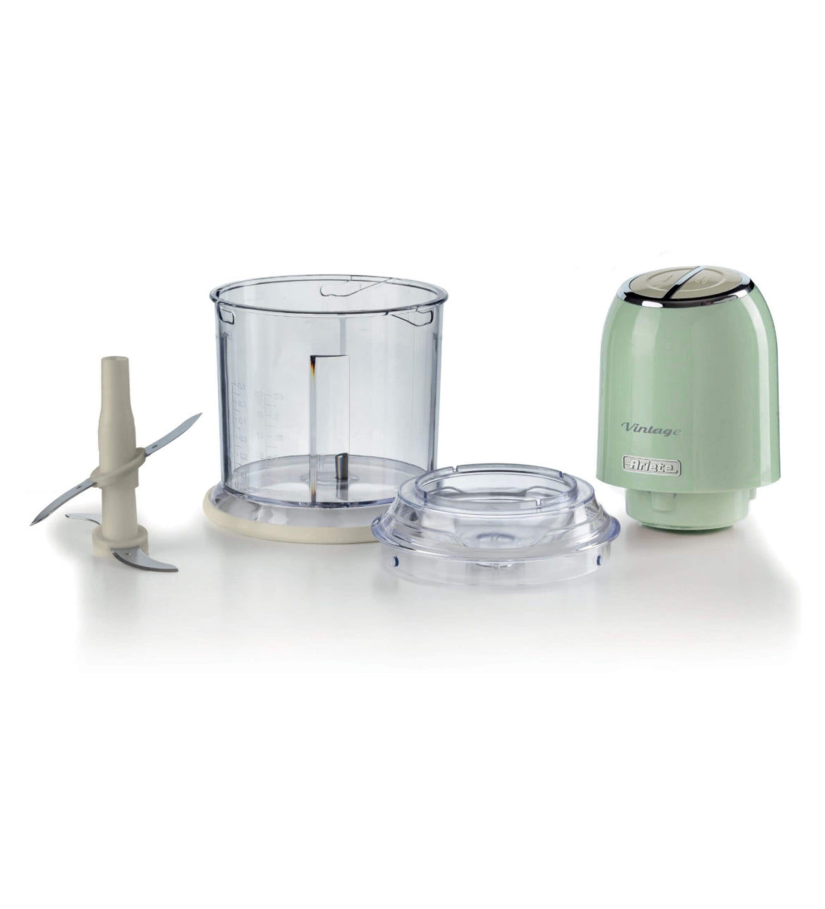 La Linea Vintage di Ariete si arricchisce di un prodotto indispensabile per le tue ricette in cucina: un tritatutto elettrico dalle linee retrò e dai tenui colori pastello, perfetto per portare un tocco di stile e funzionalità nella tua cucina. Grazie alla sua potenza di 400 Watt e alle 4 lame in Acciaio Inox, il Chopper Vintage ti consente di tritare qualsiasi ingrediente per le tue ricette: dalle verdure alla carne, formaggio, pane, frutta secca e perfino al ghiaccio. Le 2 velocità, azionabili con i due pulsanti posti sulla sommità del Tritatutto, ti permettono di sminuzzare o tritare finemente gli alimenti, mentre I piedini antiscivolo ti assicurano la massima adesione del prodotto al piano di lavoro.