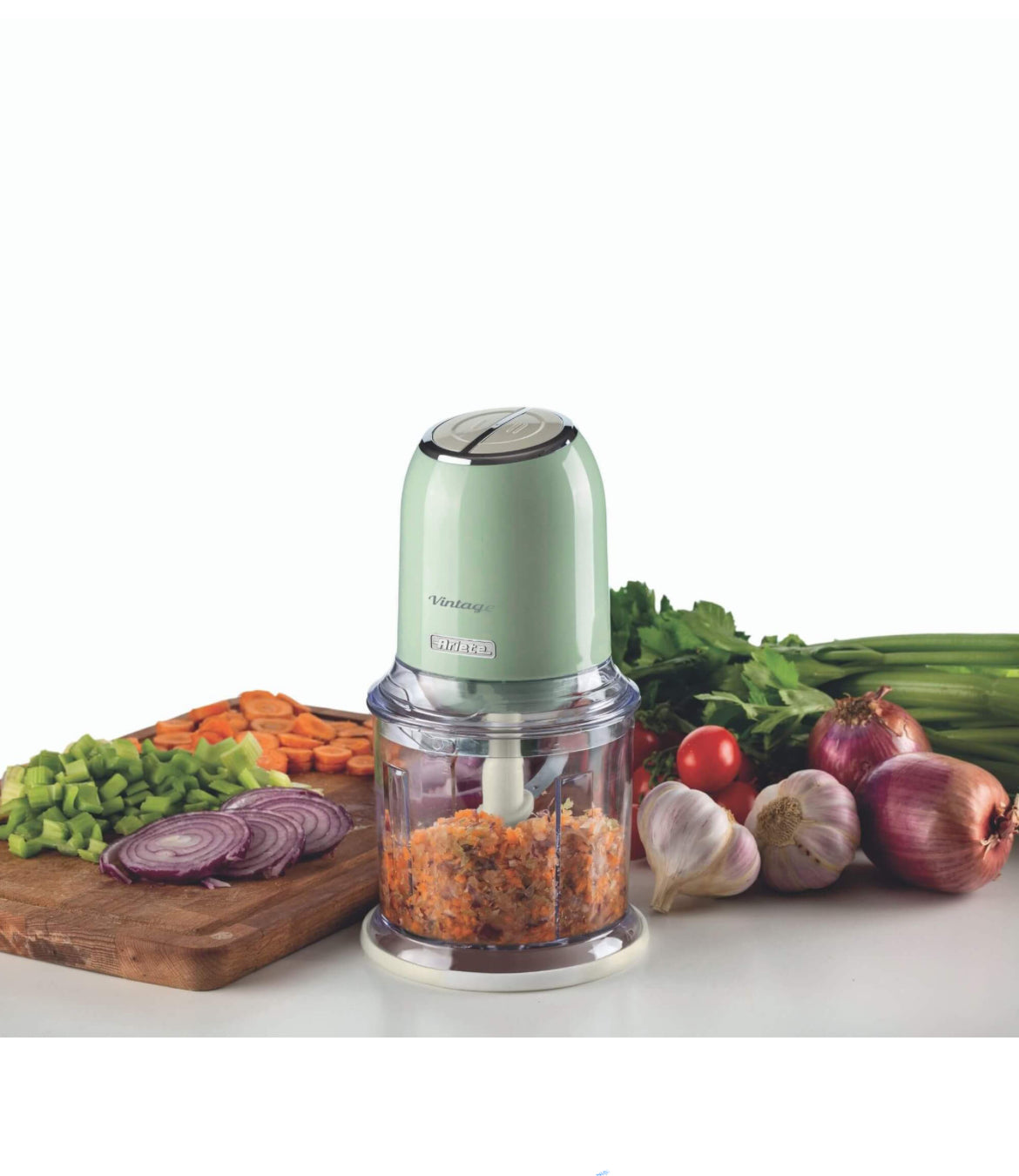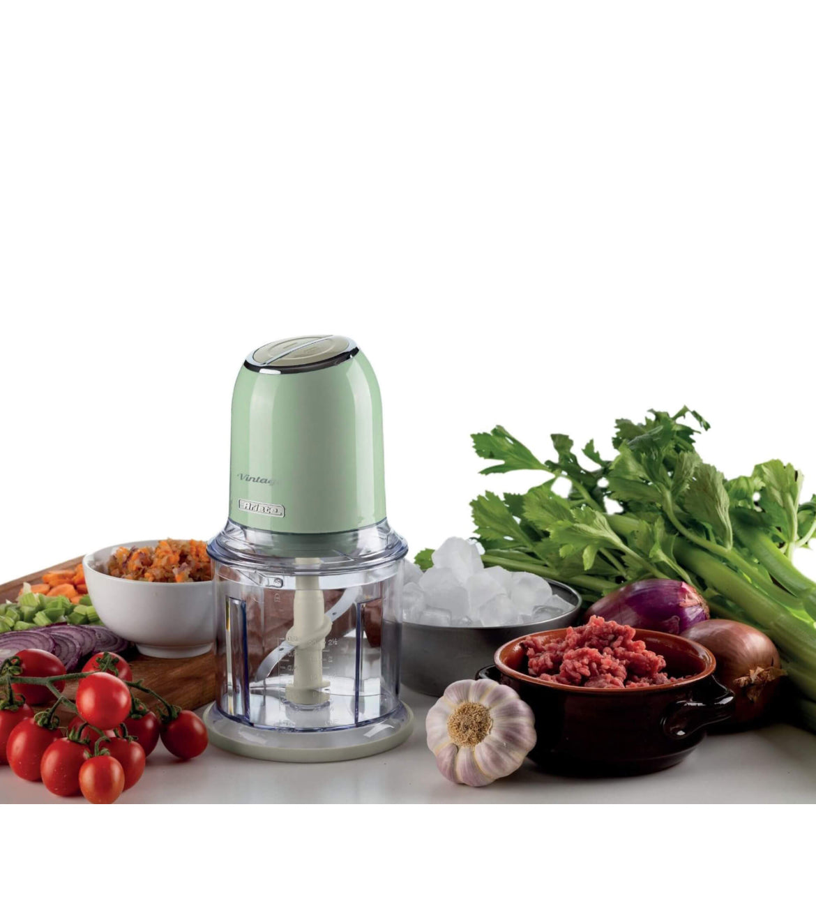 Vintage Tritatutto Vintage Verde 0438/04 Tritatutto a 2 velocità, 2 pulsanti e 4 lame in Acciaio Inox. Tritaverdure e Tritaghiaccio. Tazza graduata da 600ml.